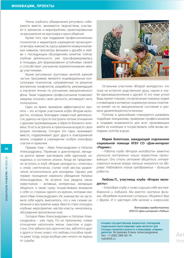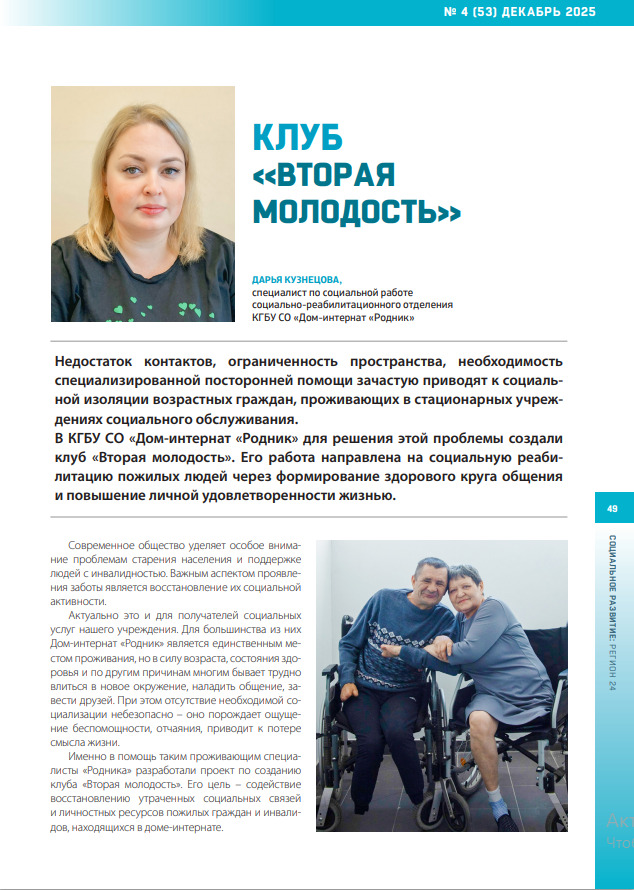 В декабрьском номере журнала «Социальное развитие: регион 24» вышла статья специалиста Дома-интерната «Родник» Дарьи Кузнецовой.