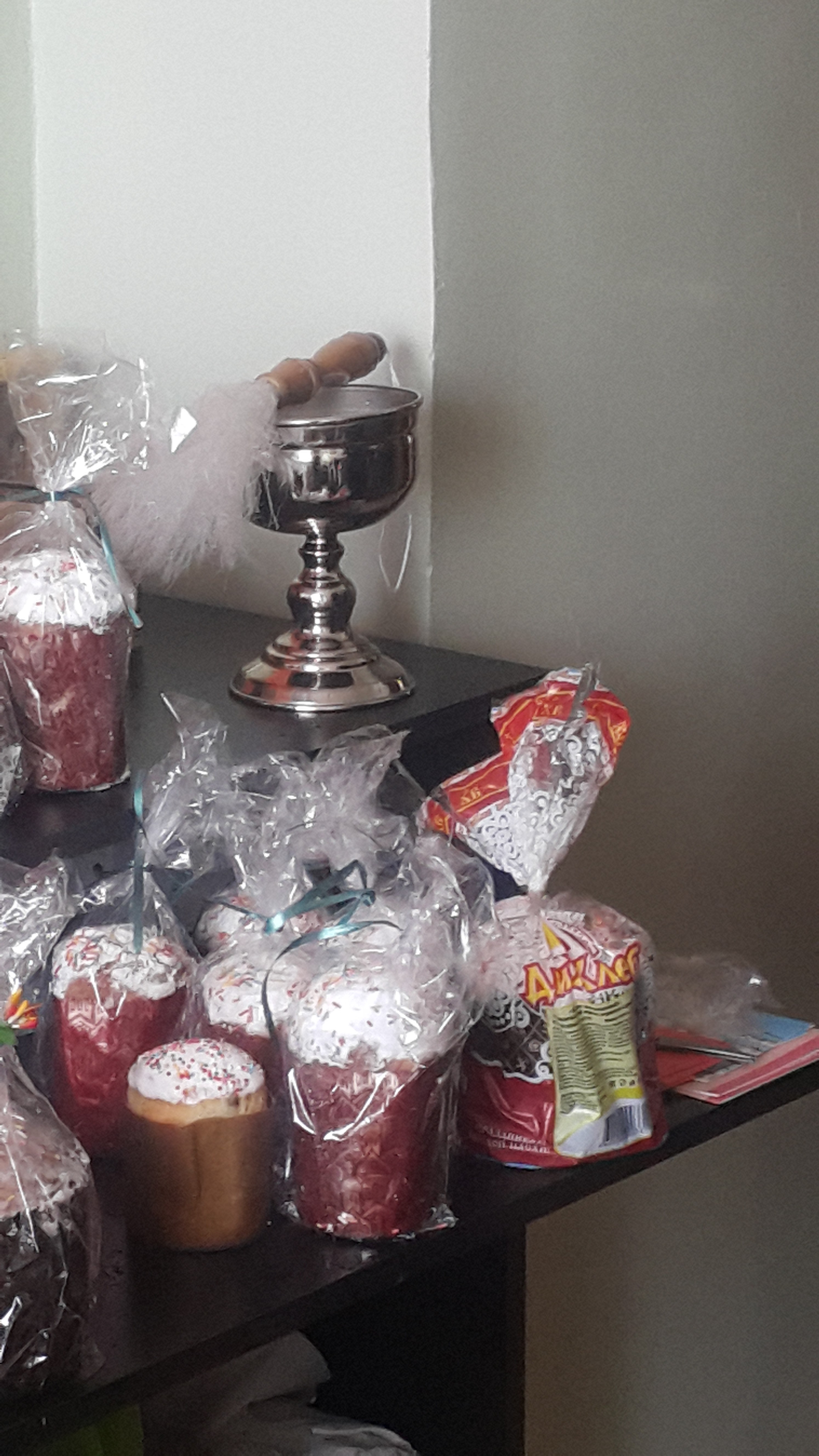 28 апреля в день Святой Пасхи батюшка Василий от храма Рождества Христова отслужил праздничный молебен и освятил пасхальные куличи для граждан, находящихся на обслуживании.