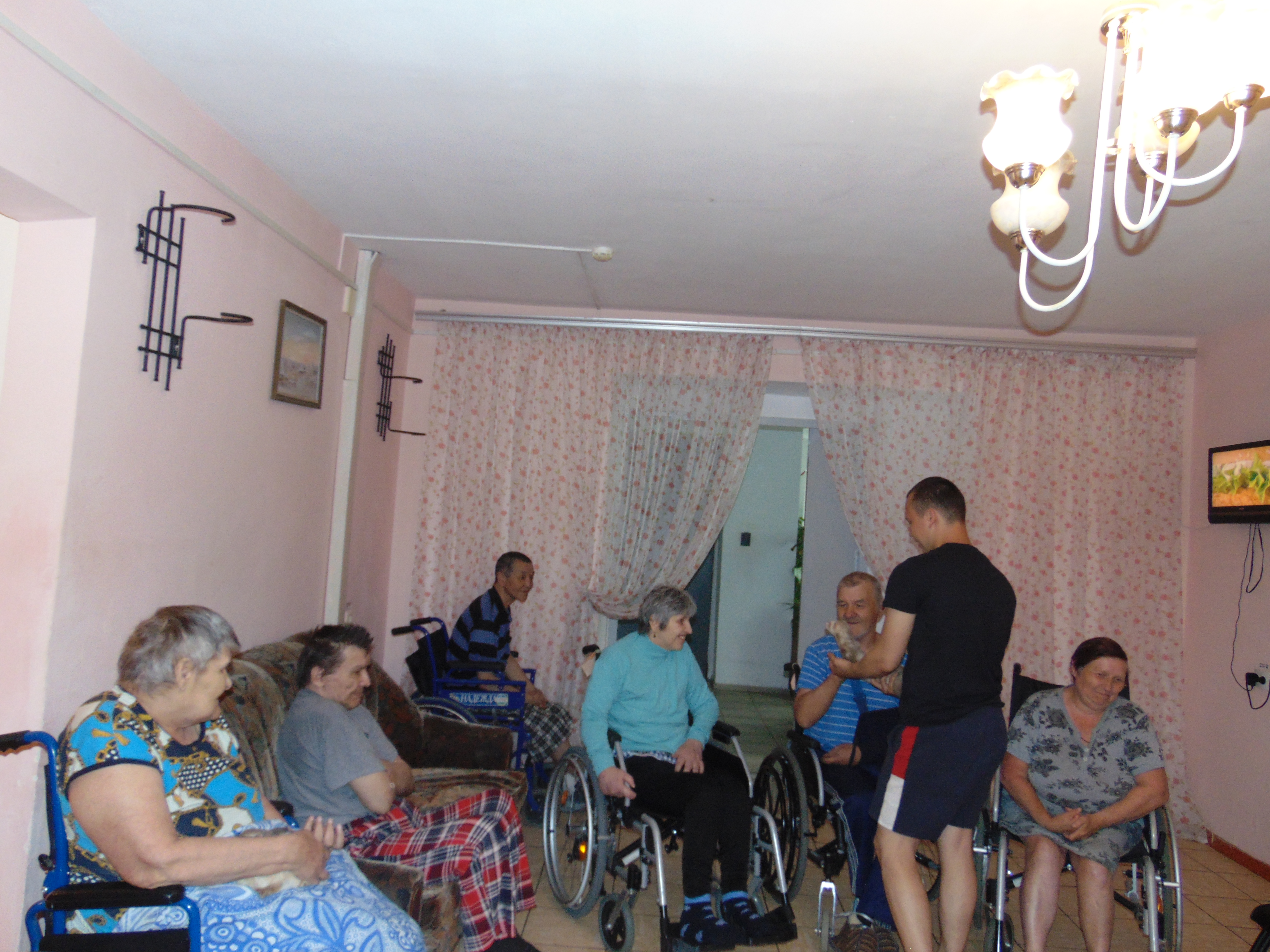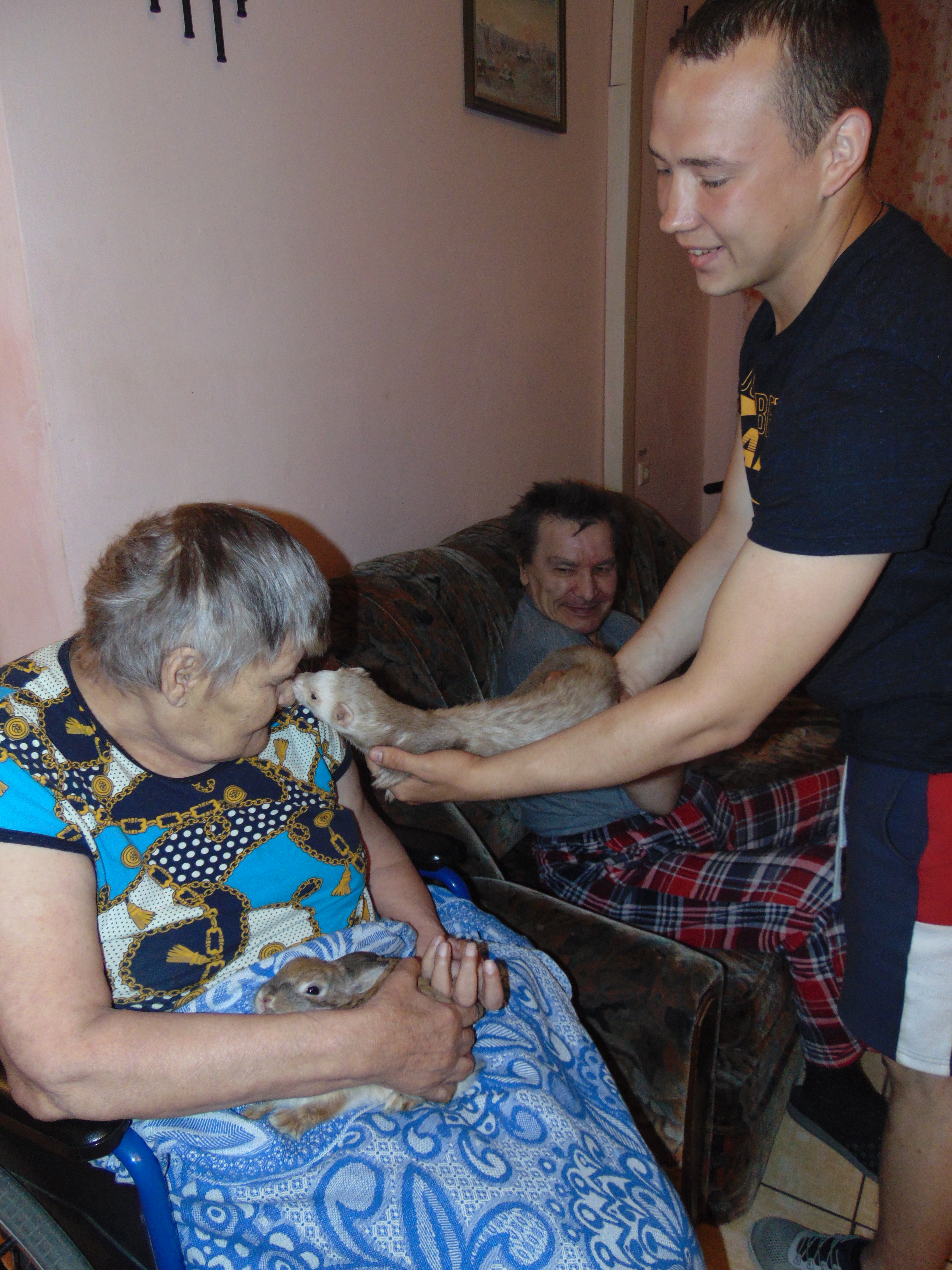 Дождливым и холодным июньским утром  животные принесли ноту радости и уюта в Учреждение, чтобы зажечь улыбки на лицах людей. Чего только стоит поцелуй от хорька Ричи, который искренне проникся любовью к нашей подопечной!
