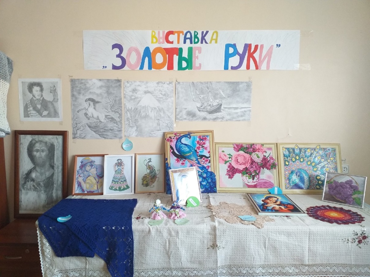 24 января в пансионате для граждан пожилого возраста и инвалидов прошла выставка «Золотые руки».  На выставке были представлены работы в разной технике: вышивка крестиком, связанные из пряжи крючком и спицами, графика, картины из бисера,  сделанные получателями социальных услуг проживающих в пансионате.
