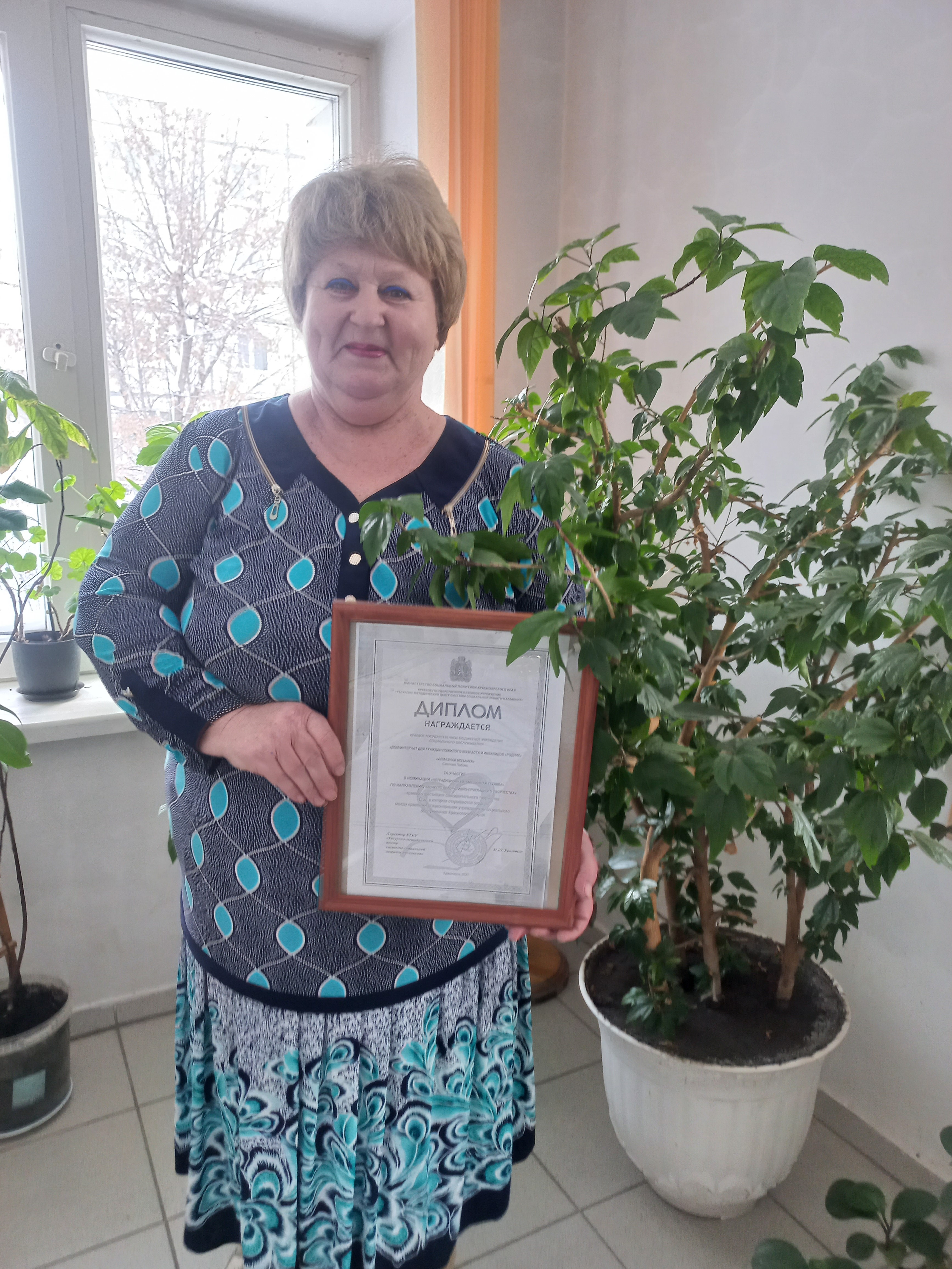 Получатель социальных услуг дома-интерната Смелова Любовь Петровна награждена дипломом за участие в конкурсе в номинации «Нетрадиционная, смешанная техника» по направлению «Конкурс декоративно-прикладного творчества».
